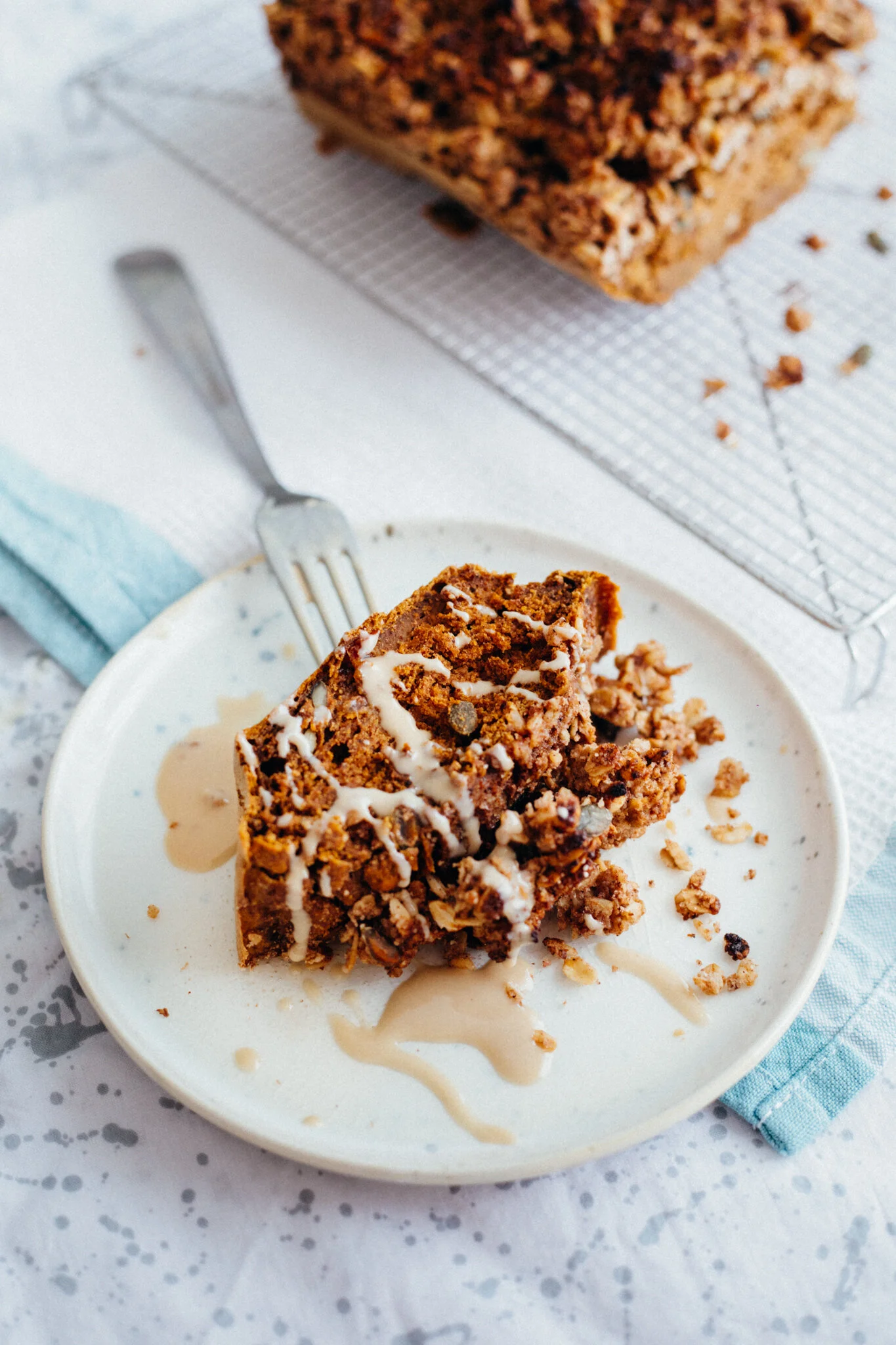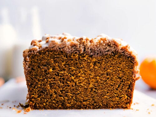 Moist pumpkin bread with a pumpkin spice streusel topping and a sticky maple glaze.